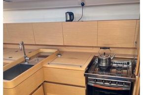 The galley is equipped with a 4-burner hob, oven, and grill, a galley sink with pressurised hot and cold water, and a refrigerator with cool box. Domestic hot water is supplied via the engine calorifier. Twin air conditioning units are fitted throughout. Both heads are fitted with quiet-flush electric toilets. Entertainment includes a Sony stereo system (2020) and a television with DVD player (2020).