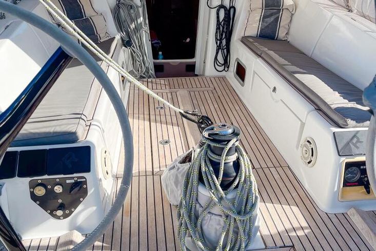 The First 50 layout works well for a couple or a small group. The three-cabin arrangement with twin heads offers good privacy, while the cockpit is both sociable and functional — a proper sailing space rather than a sun lounge with an afterthought helm. Below, the light oak interior and cream upholstery create a welcoming environment with generous headroom throughout.