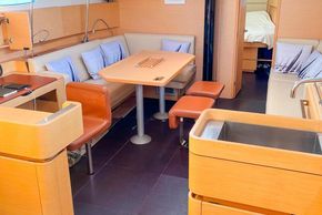 The layout comprises three cabins with berths for four to six, two heads compartments each with shower, a dedicated navigation station, and a well-positioned galley. The saloon features a central table and ample seating.