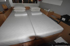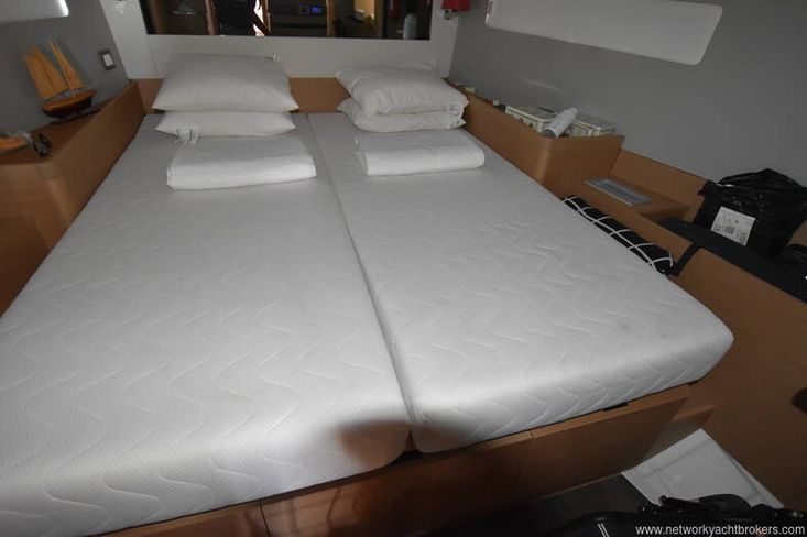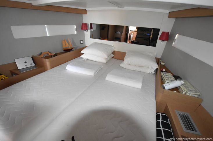 Luxury forward stateroom with walk-around queen berth and central armoire